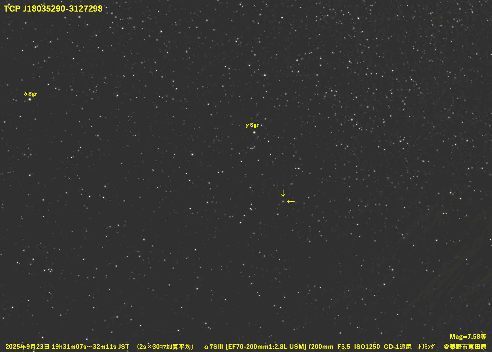 23日の夜、少しだけ雲の切れ間があったので夕方に いて座のTCP_J18035290-3127298 を撮影することができました。薄雲を通しての撮影なので精度は悪いですが 7.6等級の明るさでした。Novaだと嬉しいのですが……。