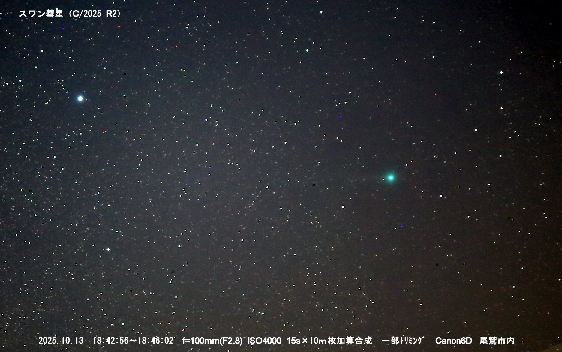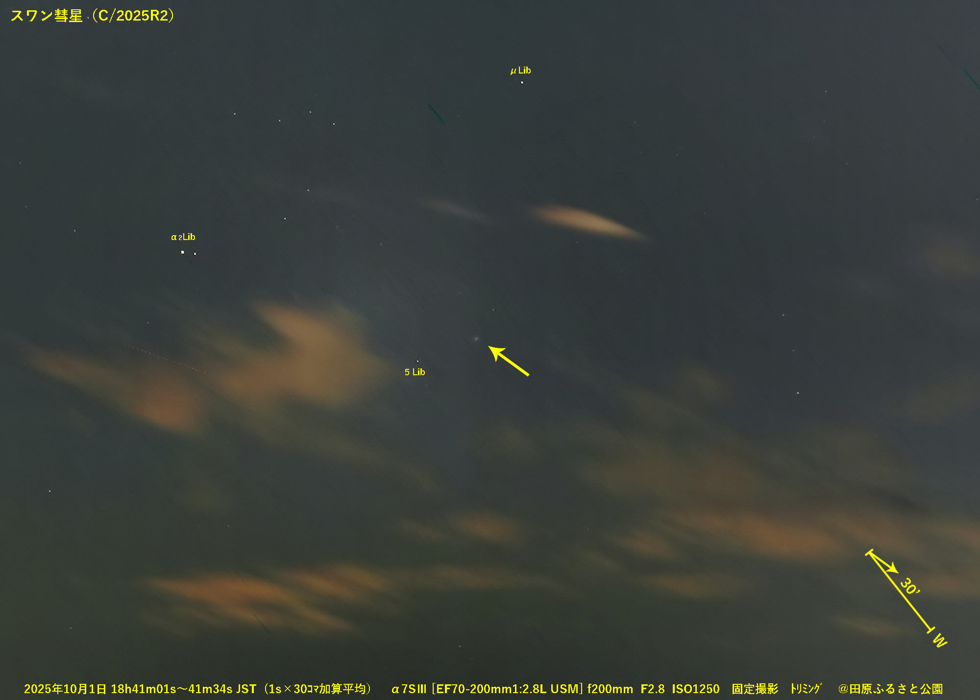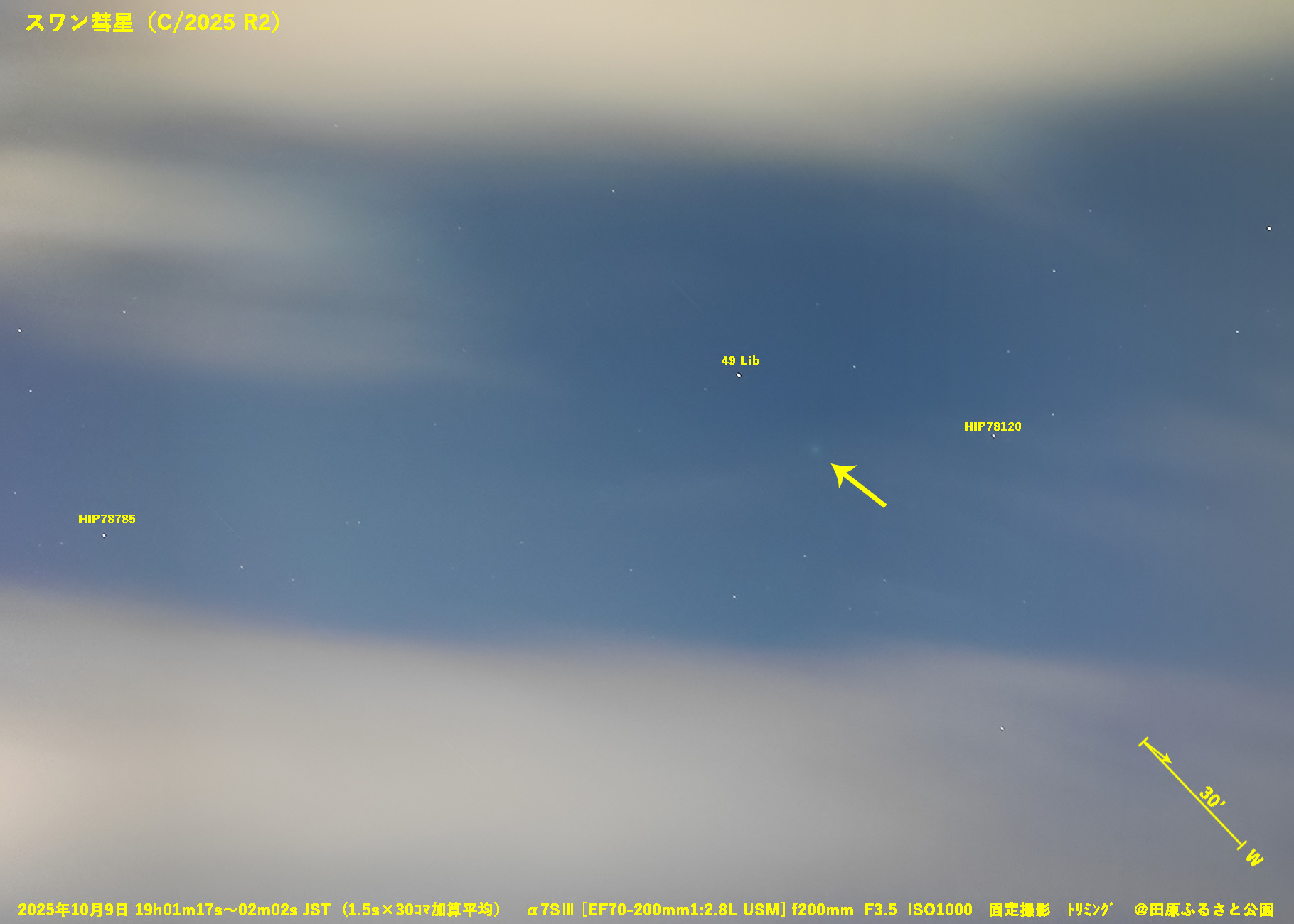 9日の夕方は台風一過で晴れる予報でしたが、実際は雲量 7〜8/10 の雲の多い天気でした。雲の隙間からスワン彗星(C/2025 R2) を撮影しましたが、尾は写らず頭部を確認するのがやっとでした。
