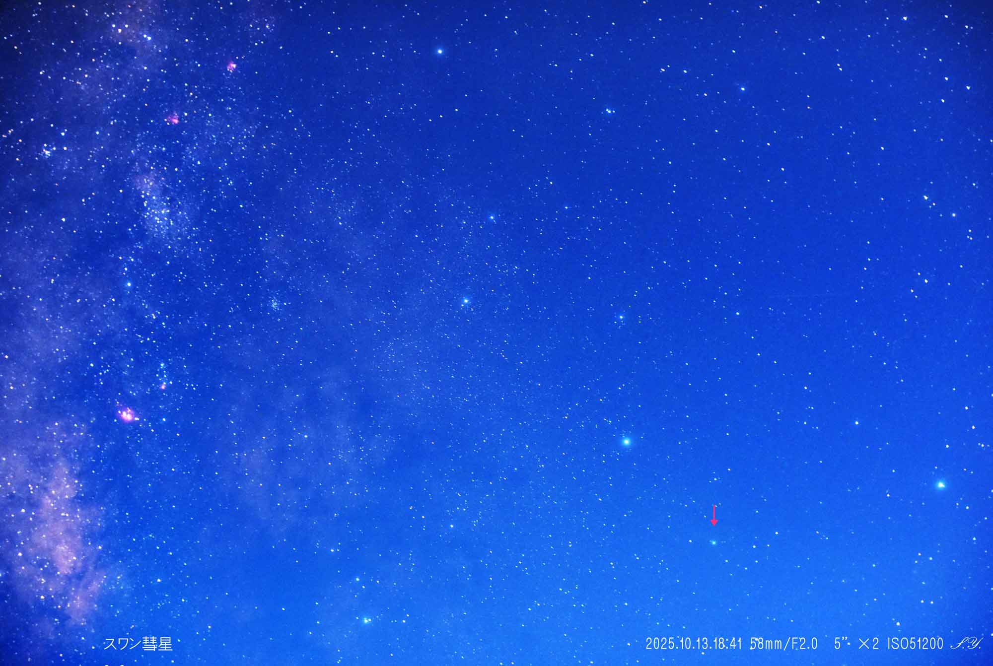 久し振りの晴れ間。今後の天気に期待できず。湾口の堤防に出かけ、スワン彗星を写しました。天ノ川に接近しており、
