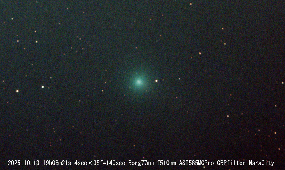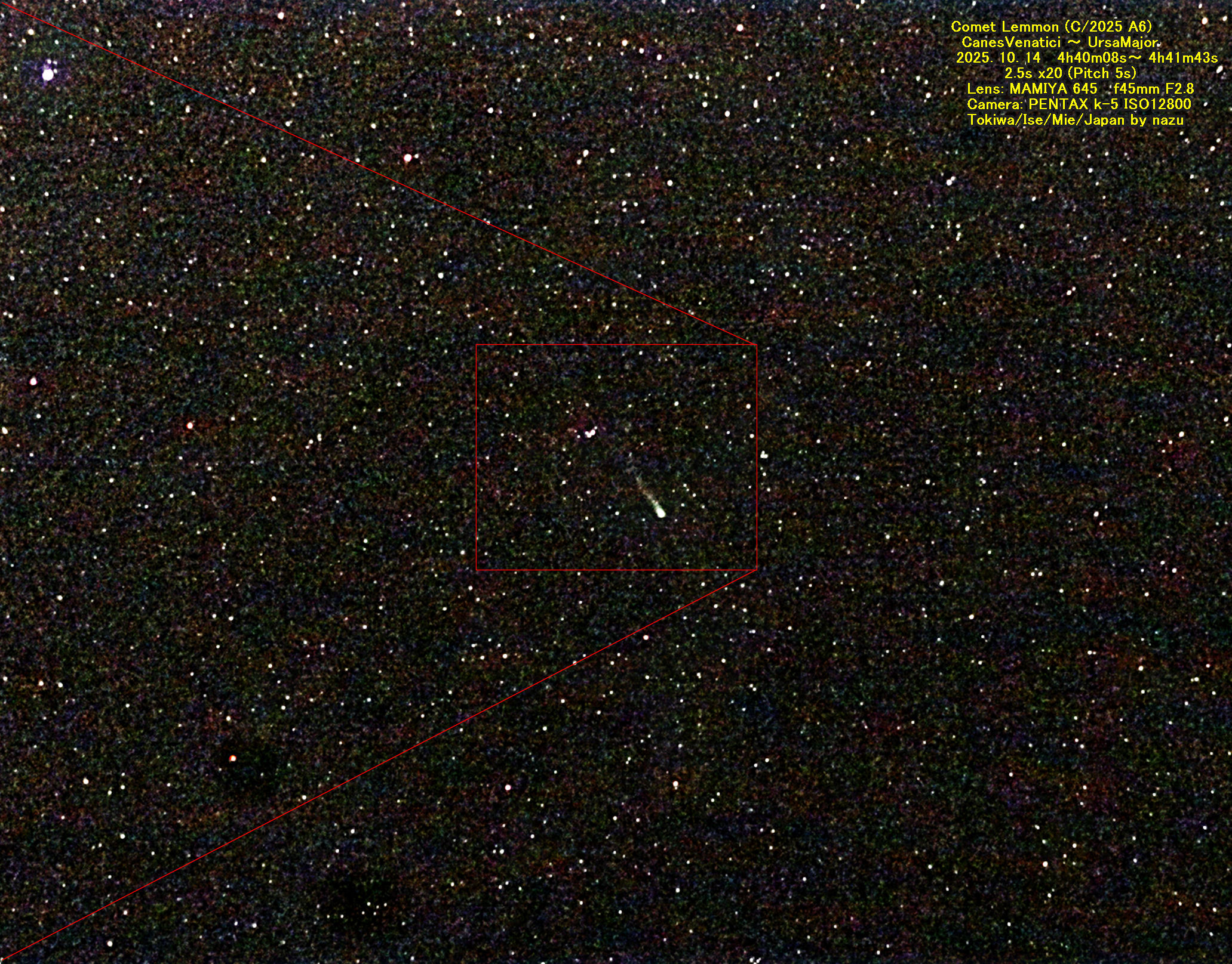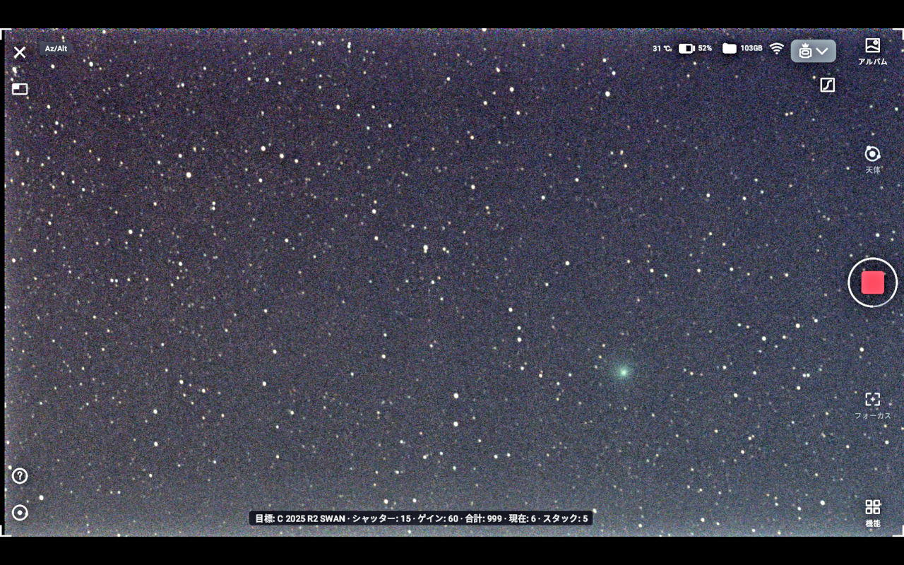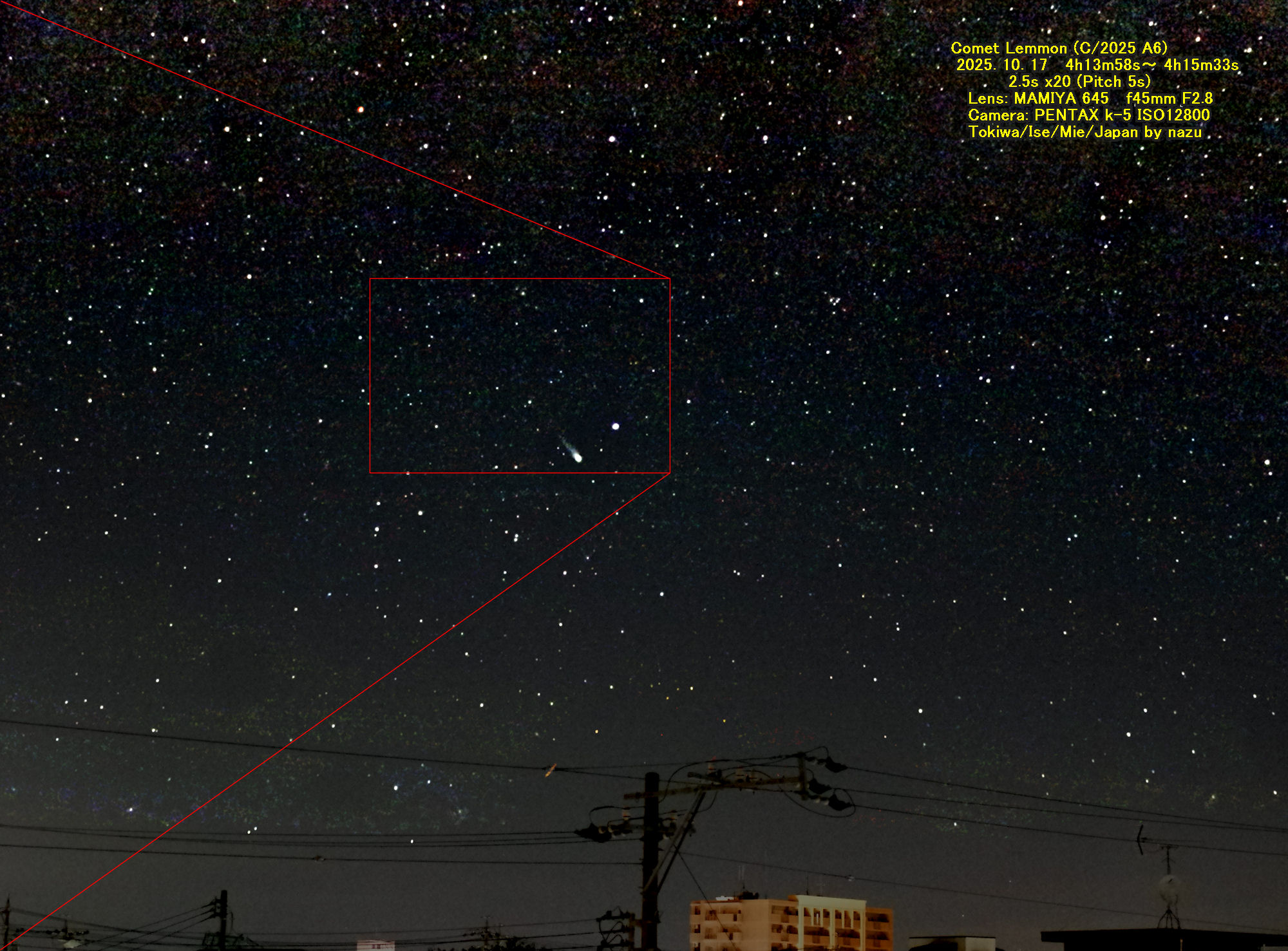 もう一方のC/2025 A6 Lemonは、夕方は北西方向なのでバルコニーからは撮影できず、明け方は、バルコニーのいつもの設置場所が屋根修理で足場があるので、望遠鏡や新兵器が設置できず、撮影できない状態が続いています…