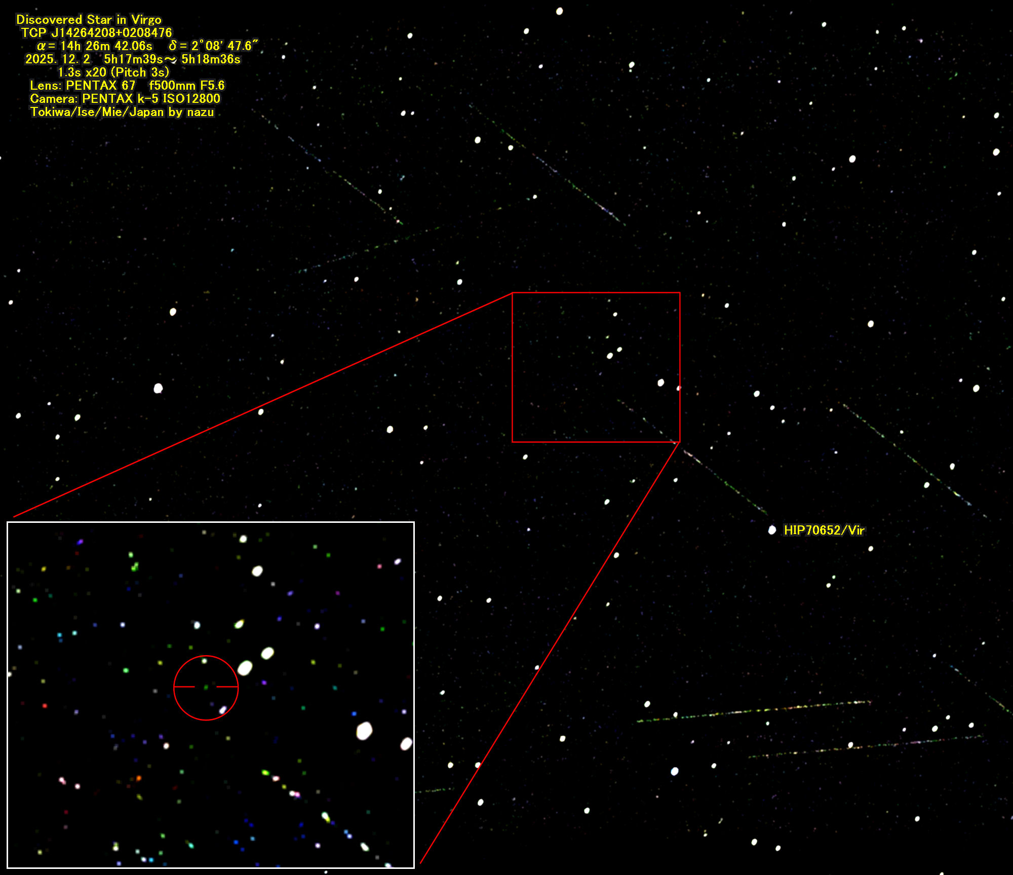 500mmの視野、約1分の間に、人工衛星5機とは…。