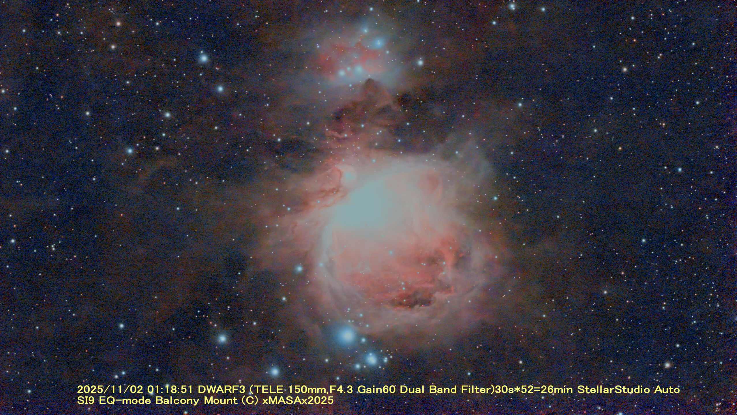 昨年末にスマート望遠鏡DWARF3で撮影したM42オリオン座大星雲です。HDR処理していないので、M42本体は白く飛んでしまいましたが、予想以上にM42周辺の分子雲が写りました。光害の酷いひたちなか自宅でも、分子雲が写ることが判り、撮影の幅が広がります。